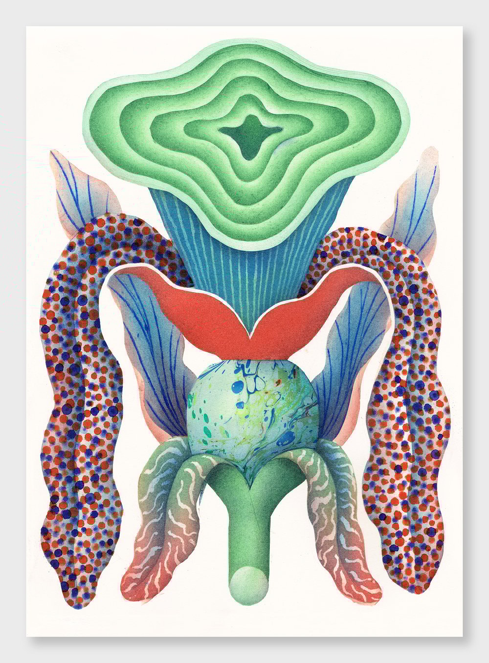 Beautifully printed by Niche, Bristol on 315gm Innova Paper. The original drawing was created using a combination of of soft pastels, paper marbling and rubber stamps.